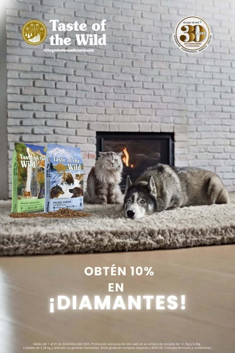 Taste of the Wild es el alimento de calidad para perros y gatos con fuentes de proteína basadas en la dieta natural de tu mascota. En cada fórmula el primer ingrediente proviene de carne, pescado o aves reales. Usamos proteínas únicas como bisonte, salmón y trucha ahumado, pato asado, pavo, codorniz y venado para hacer alimentos para perros y gatos con el mejor sabor que tu mascota ha probado.